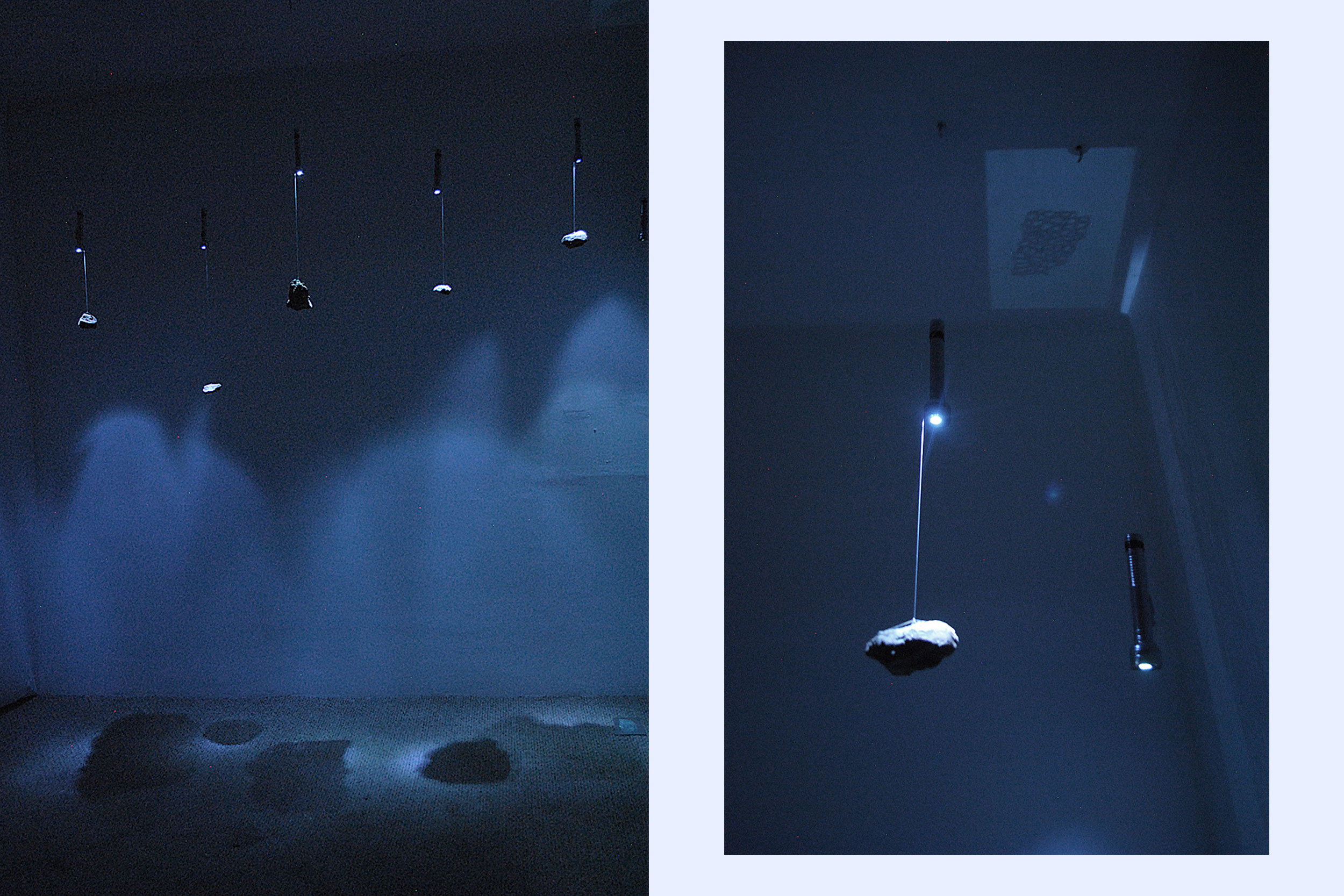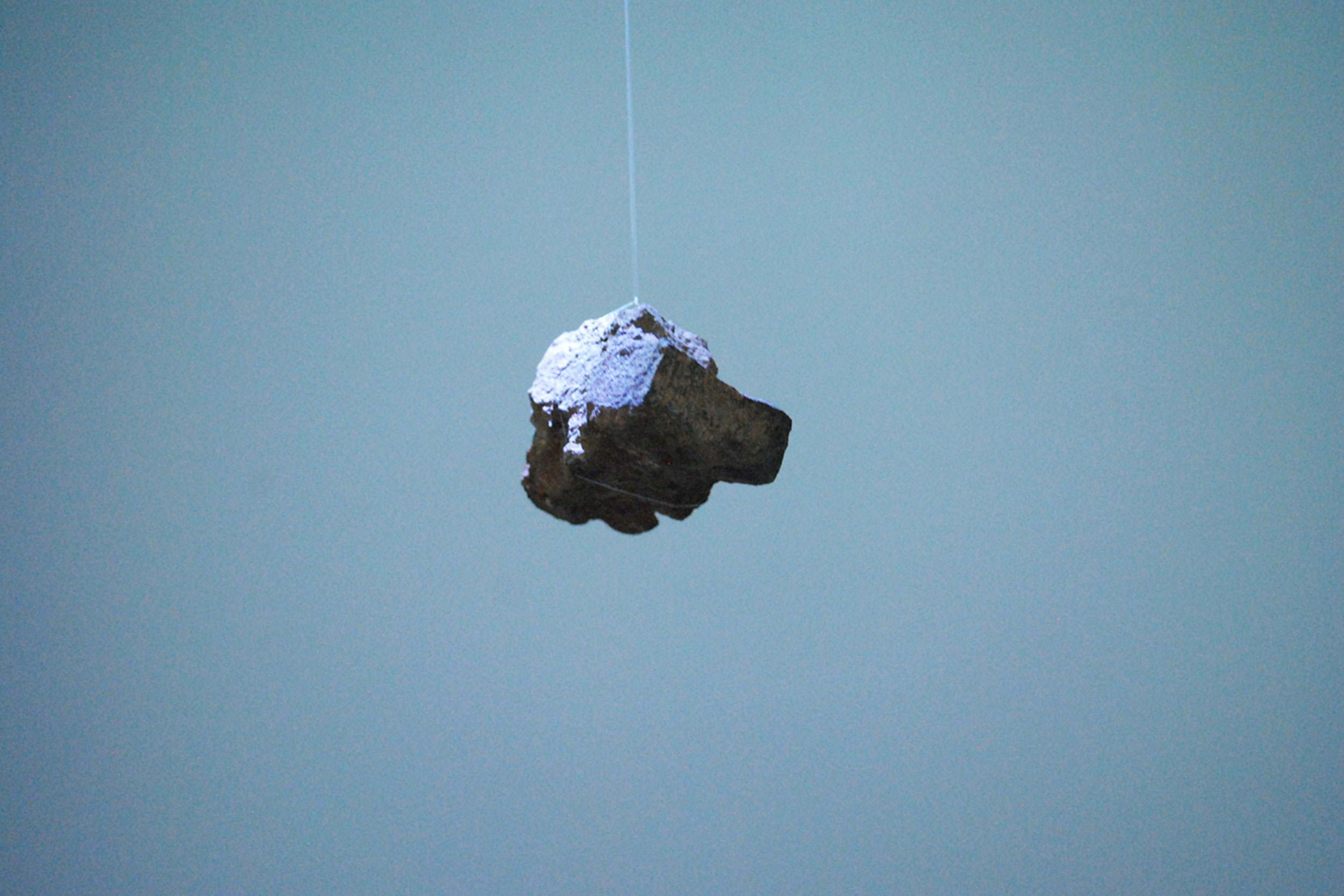 La piedra regala materia, la nube refleja, existe una correspondencia entre el cielo y la tierra, la piedra como tesoro y la nube como una visión. En el piso una nube y en el cielo una piedra, conectadas por un hilo vertical, al igual que el cuerpo sobre la tierra.