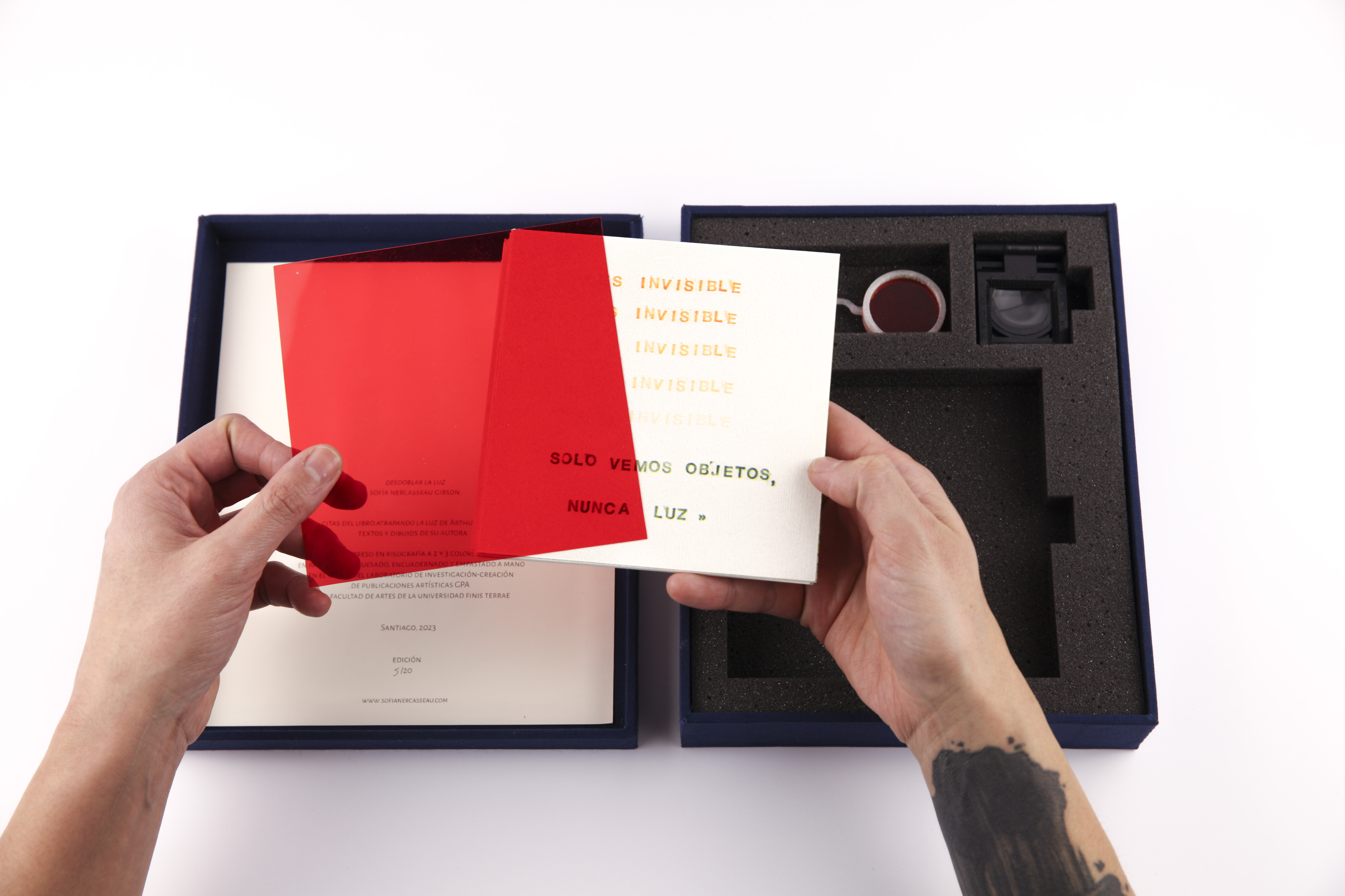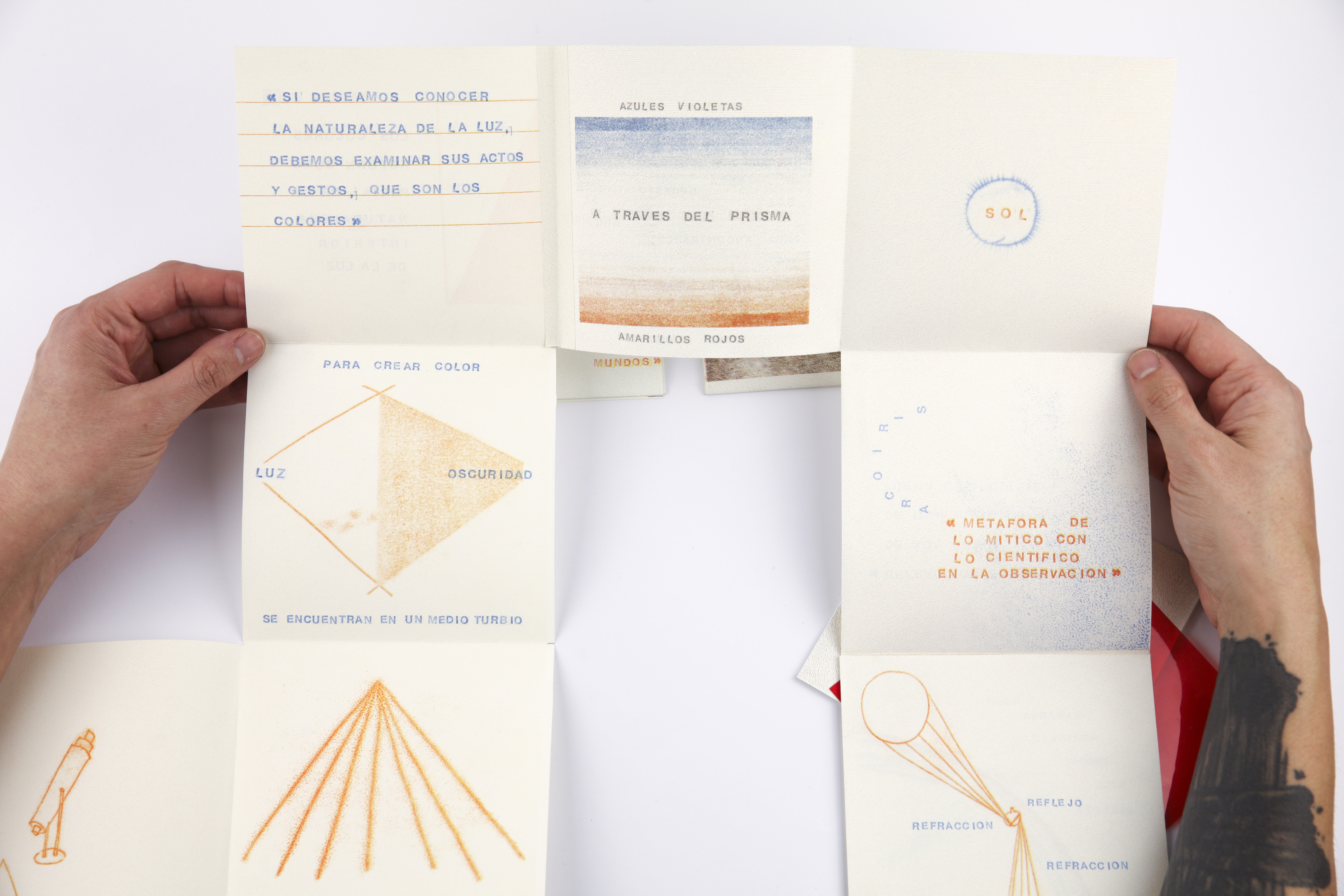 La publicación toma como punto de partida citas del libro “Atrapar la luz” de Arthur Zajonc junto con monocopias que diagraman ideas sobre la luz y los colores.