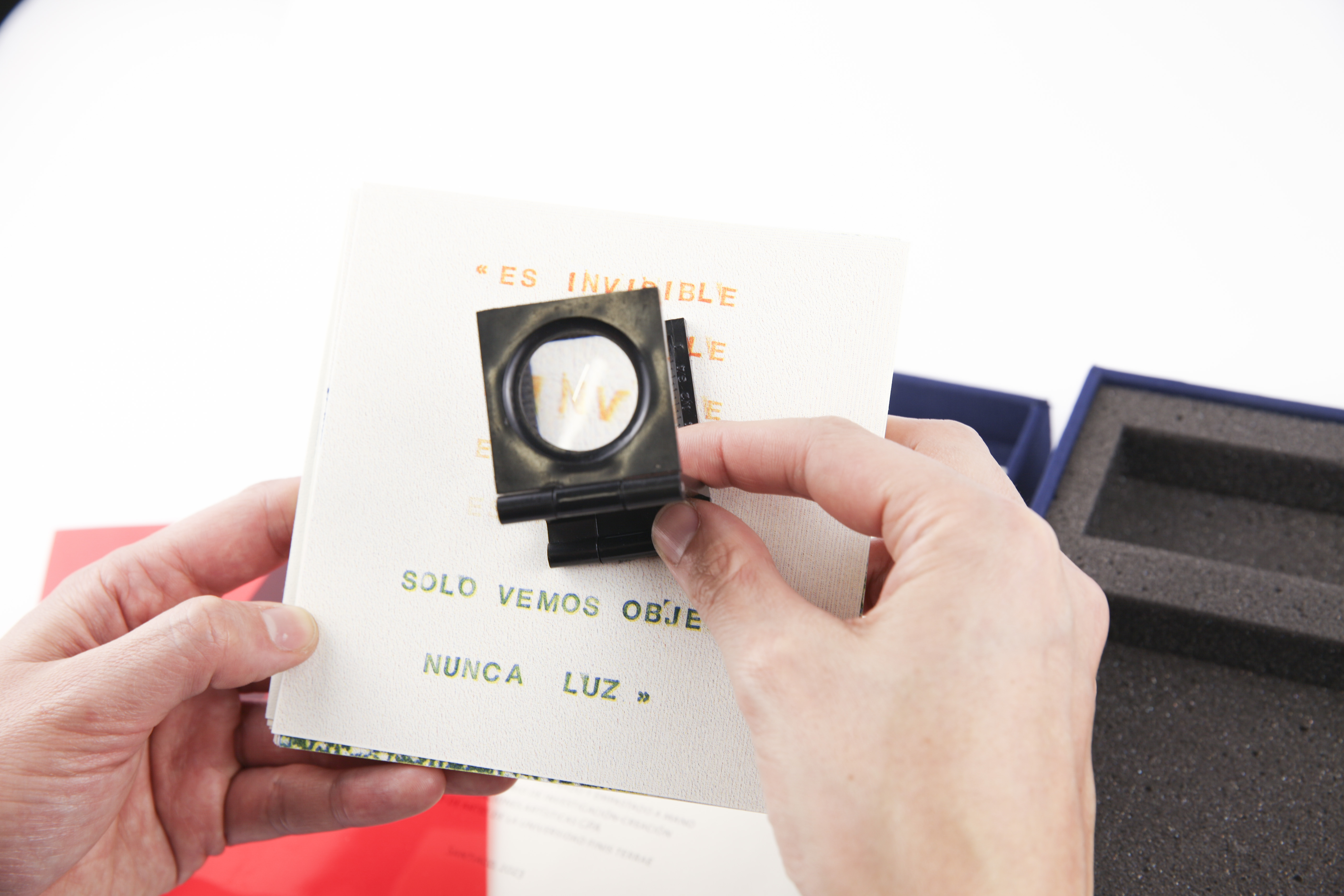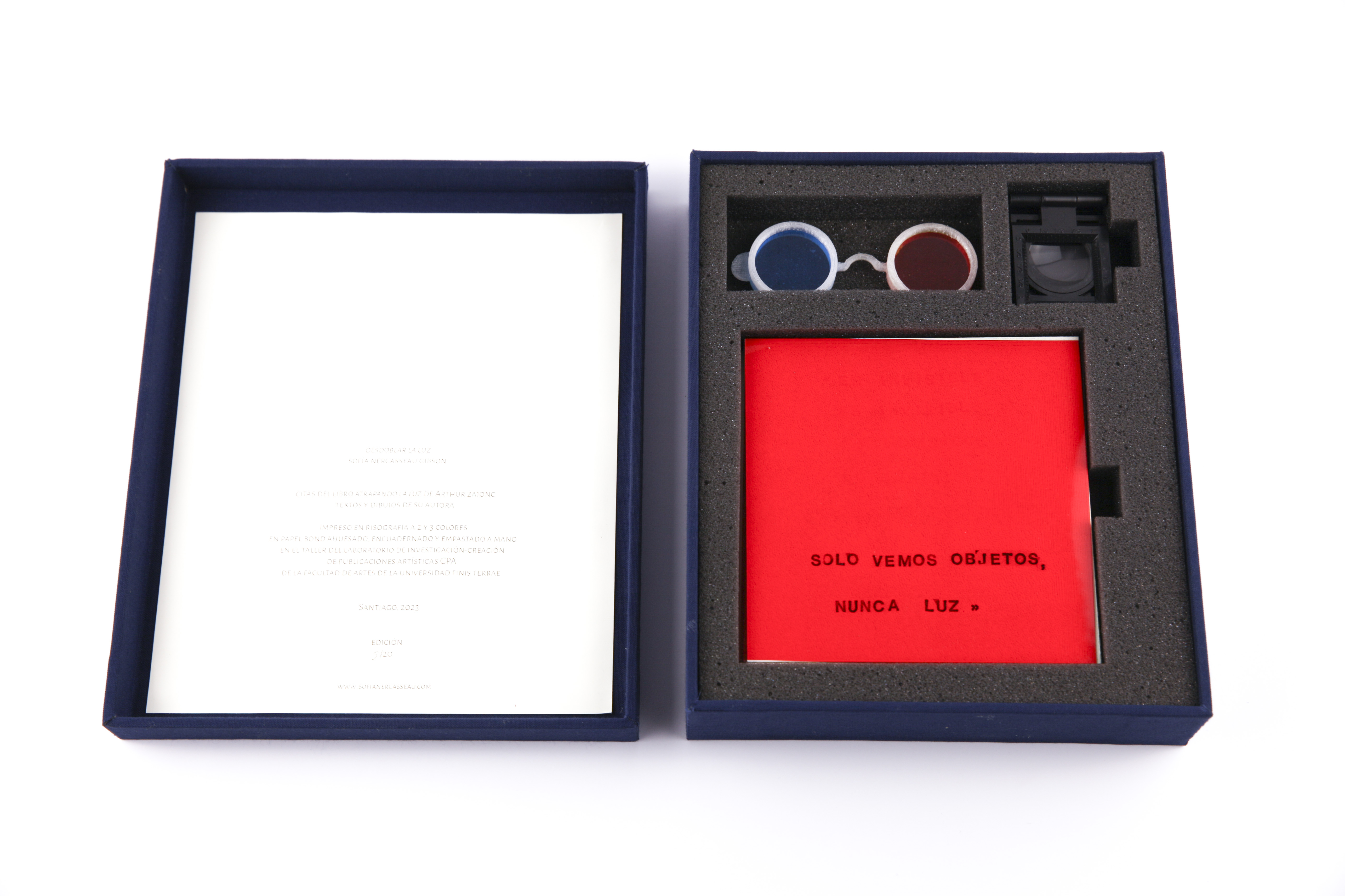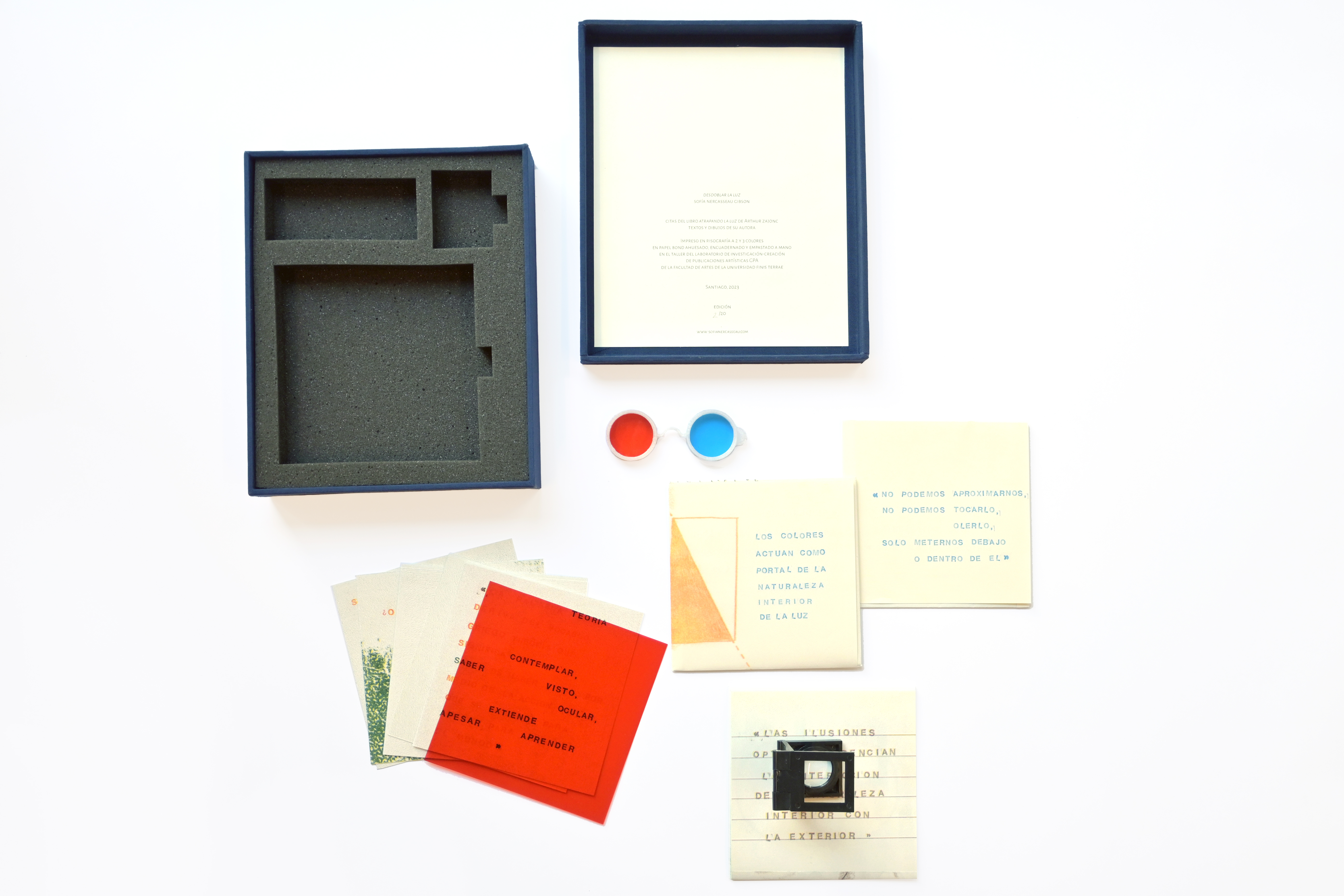 Cada caja contiene tres cuadernillos que se pueden desplegar en diferentes direcciones, seis laminas que se activan con una mica roja, un cuenta hilo y lentes 3d.